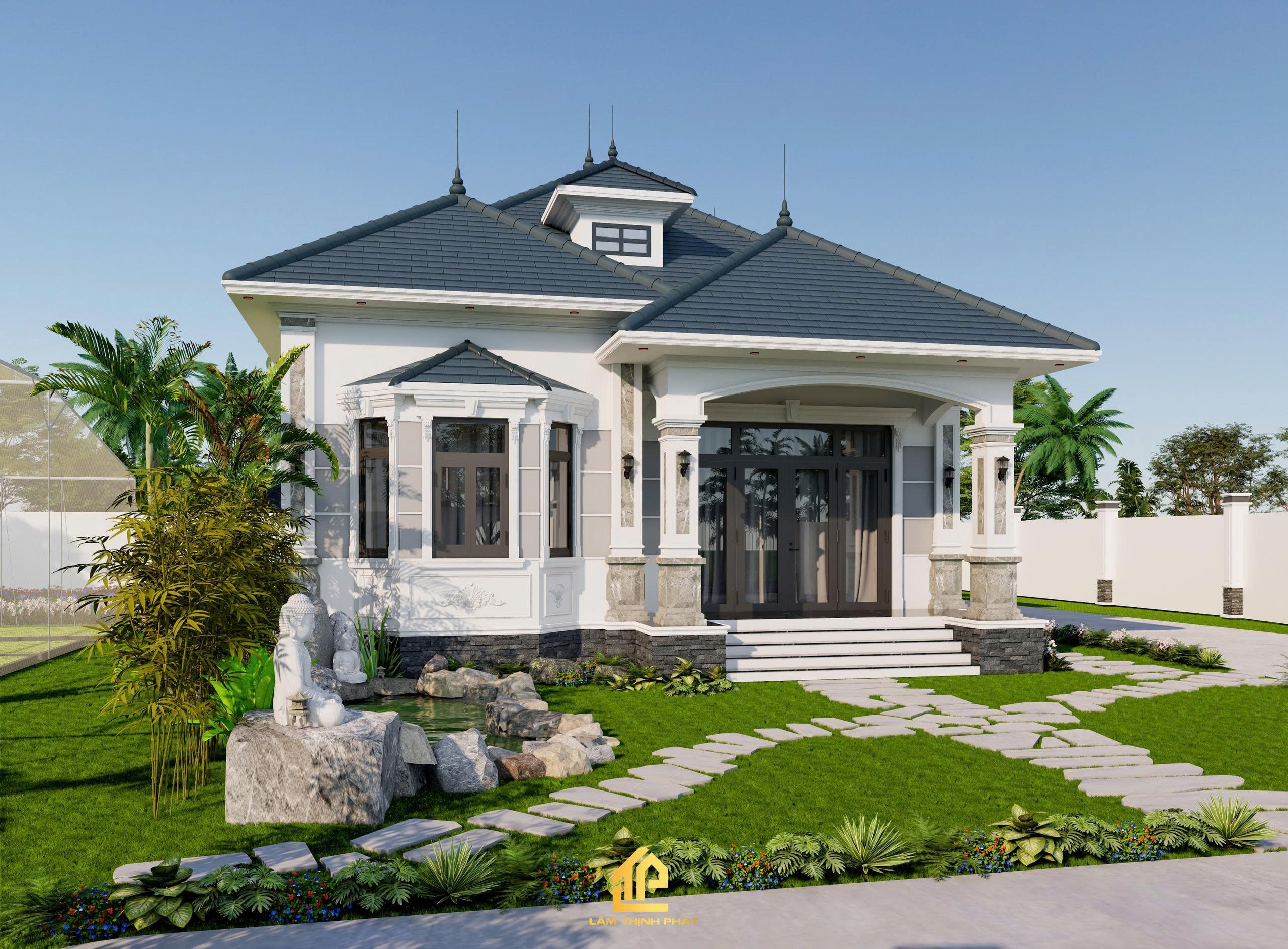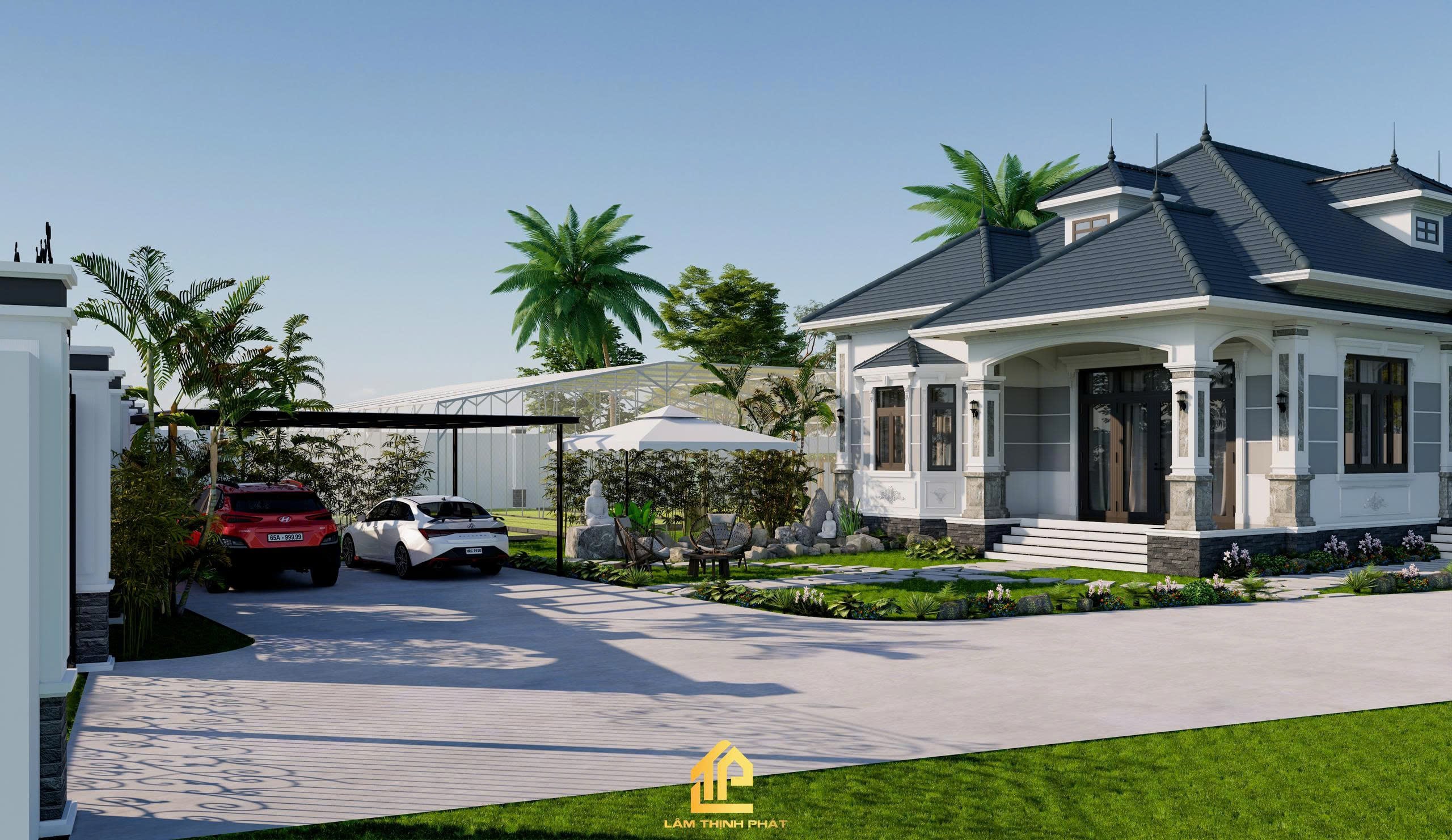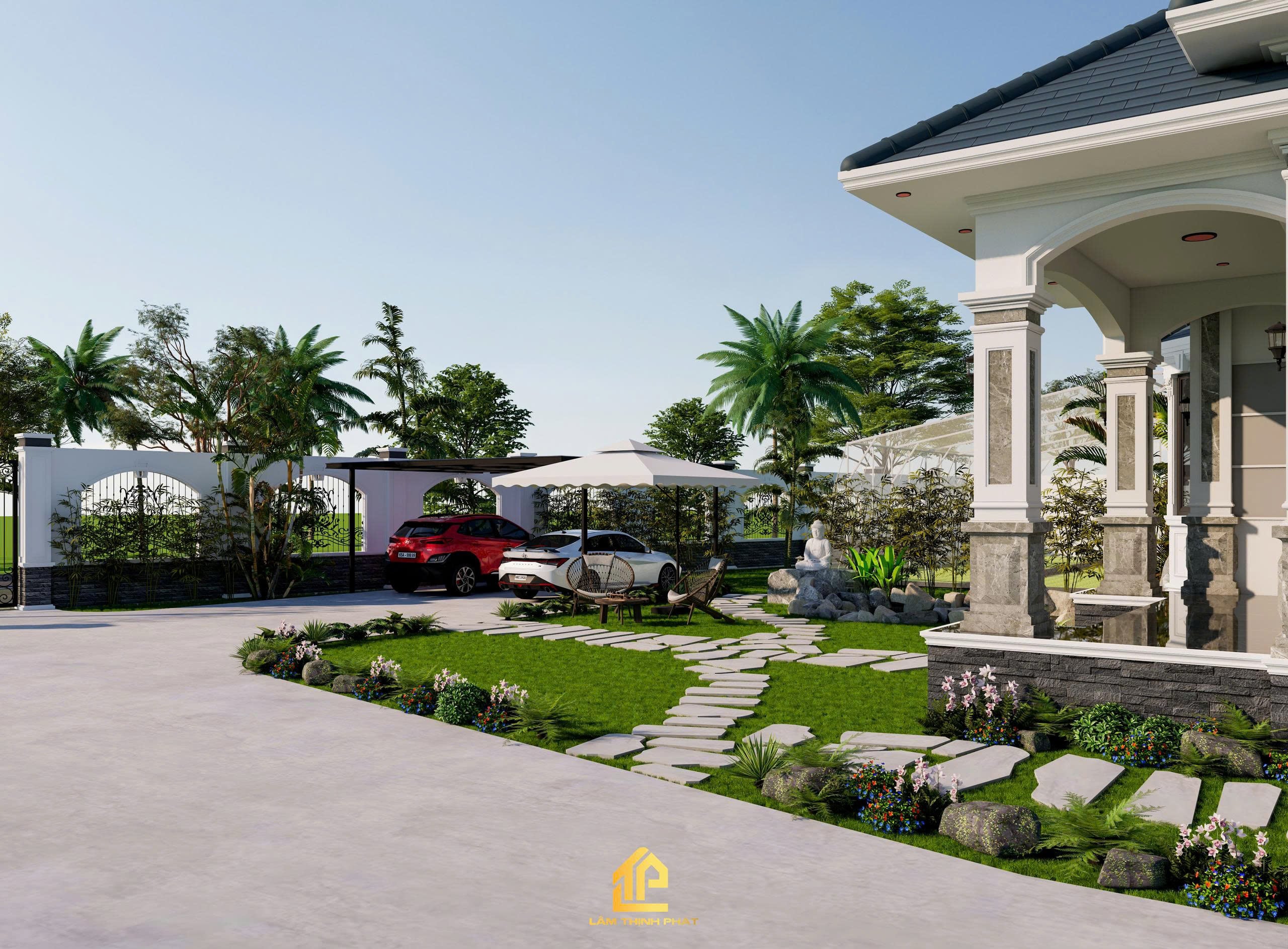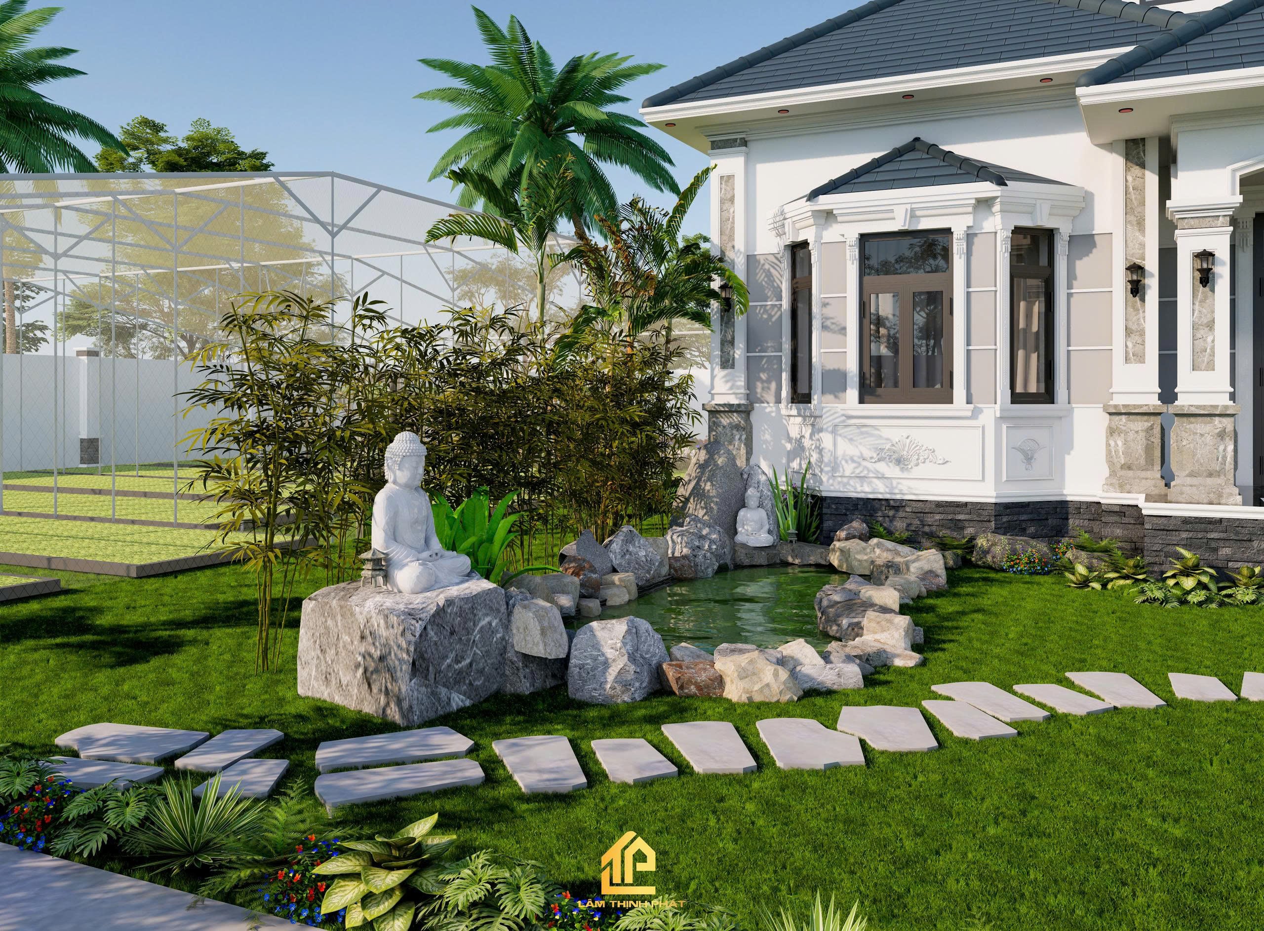 Khuôn viên rộng rãi với hệ thống cây xanh, lối đi đá uốn lượn và bãi cỏ mướt mắt giúp gia chủ tận hưởng trọn vẹn sự thư thái mỗi ngày.