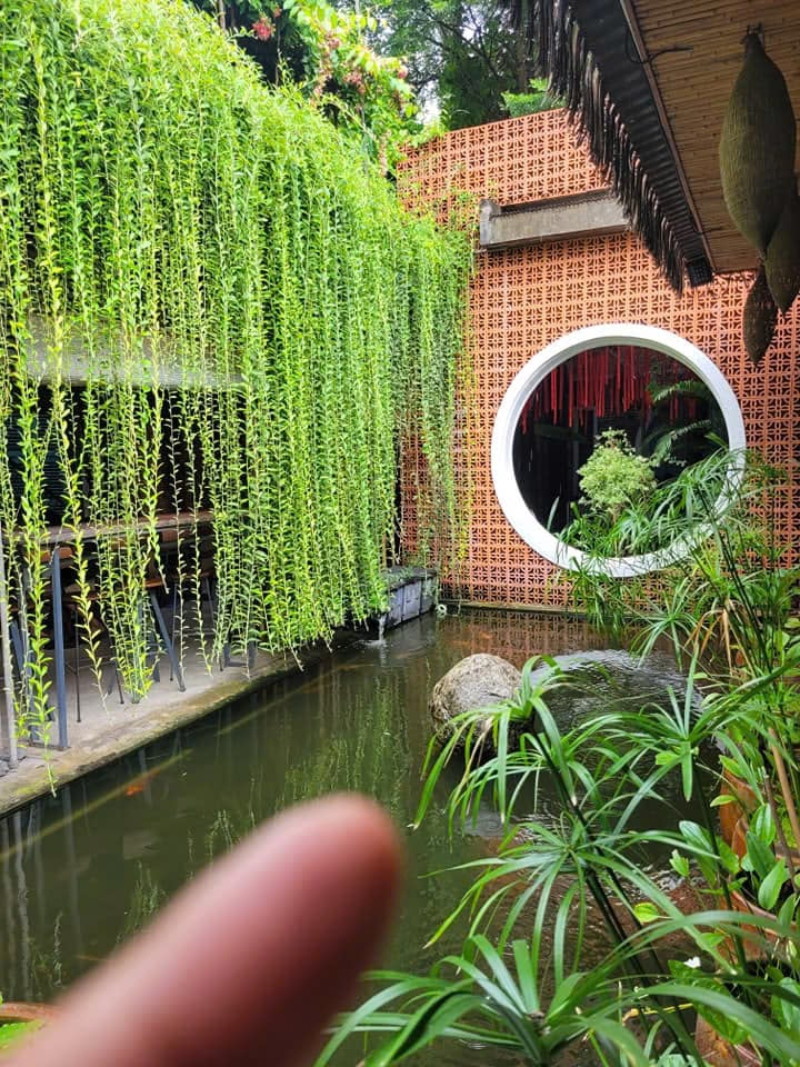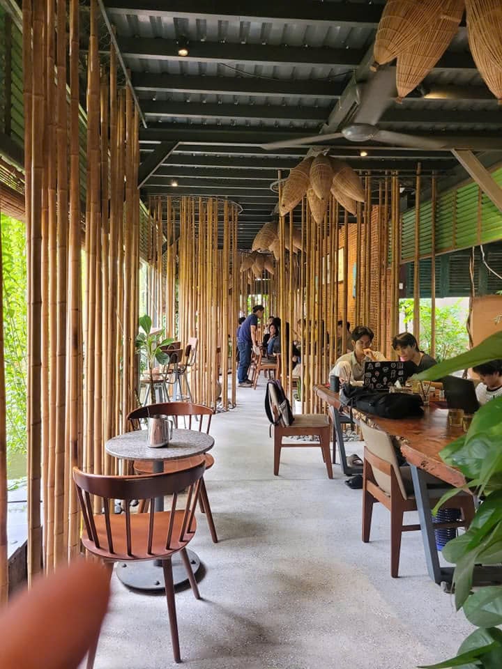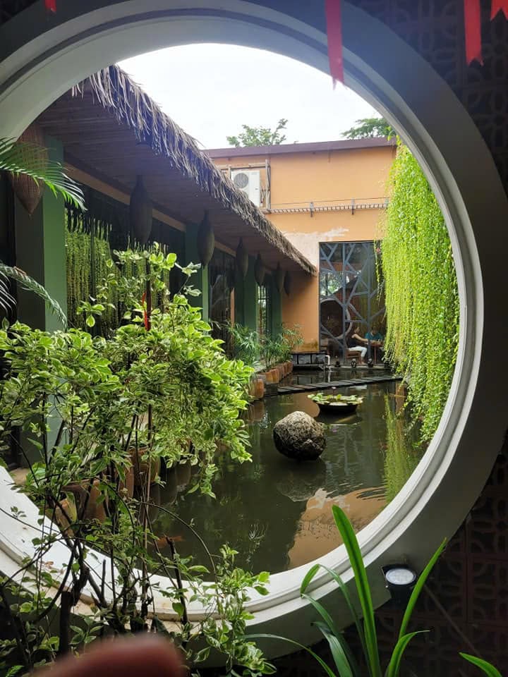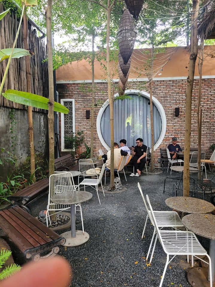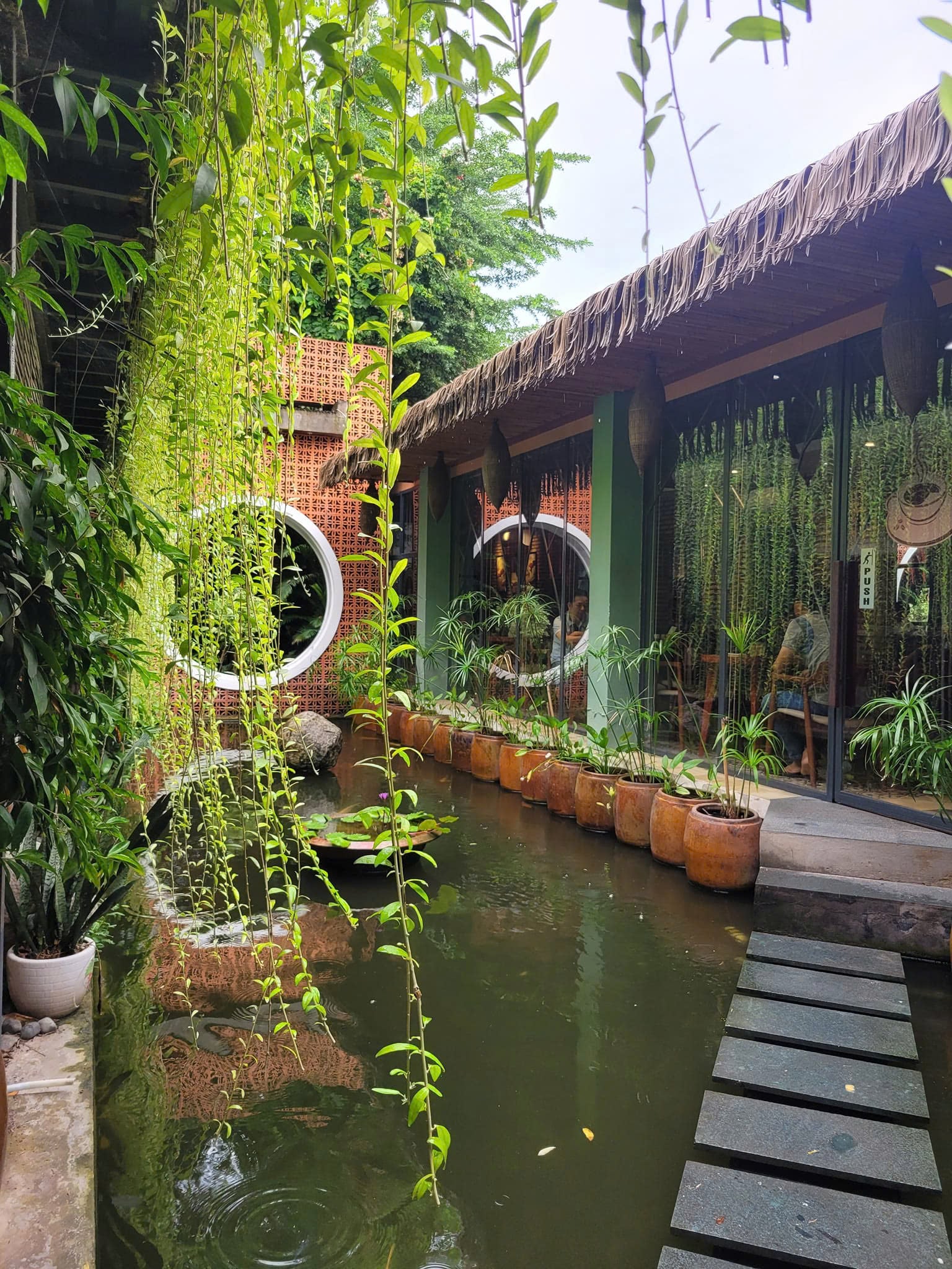 Lấy cảm hứng từ kiến trúc mộc mạc – hiện đại, quán được thiết kế với nhiều mảng xanh, hồ nước, giàn dây rũ và những ô cửa tròn đặc trưng, tạo nên dấu ấn thị giác độc đáo ngay khi bước vào. Mỗi góc đều mang nét nghệ thuật, vừa hài hòa thiên nhiên vừa tối ưu cảm giác thoáng mát, giúp khách có thể dễ dàng “bắt được” những tấm hình tuyệt đẹp.