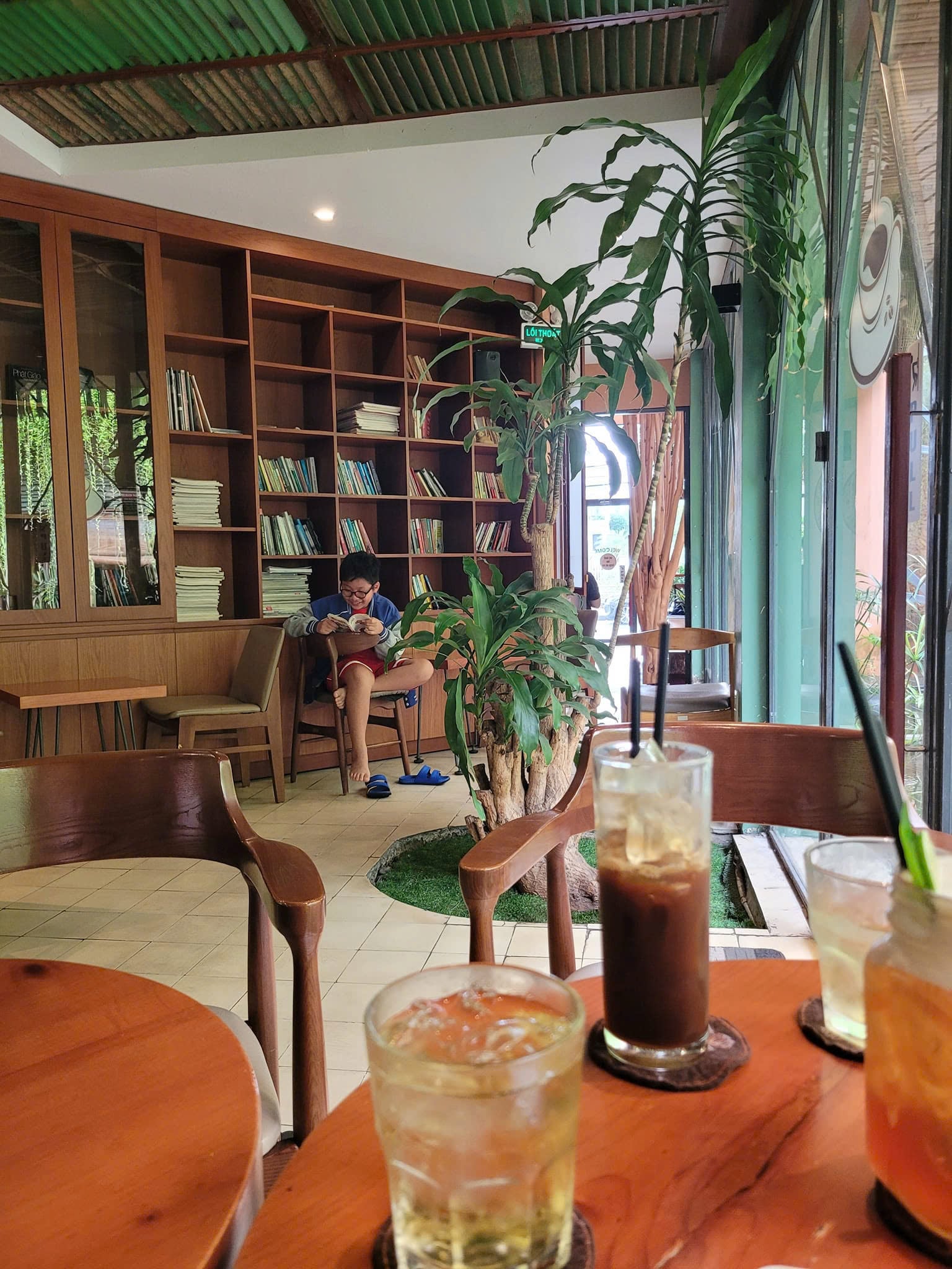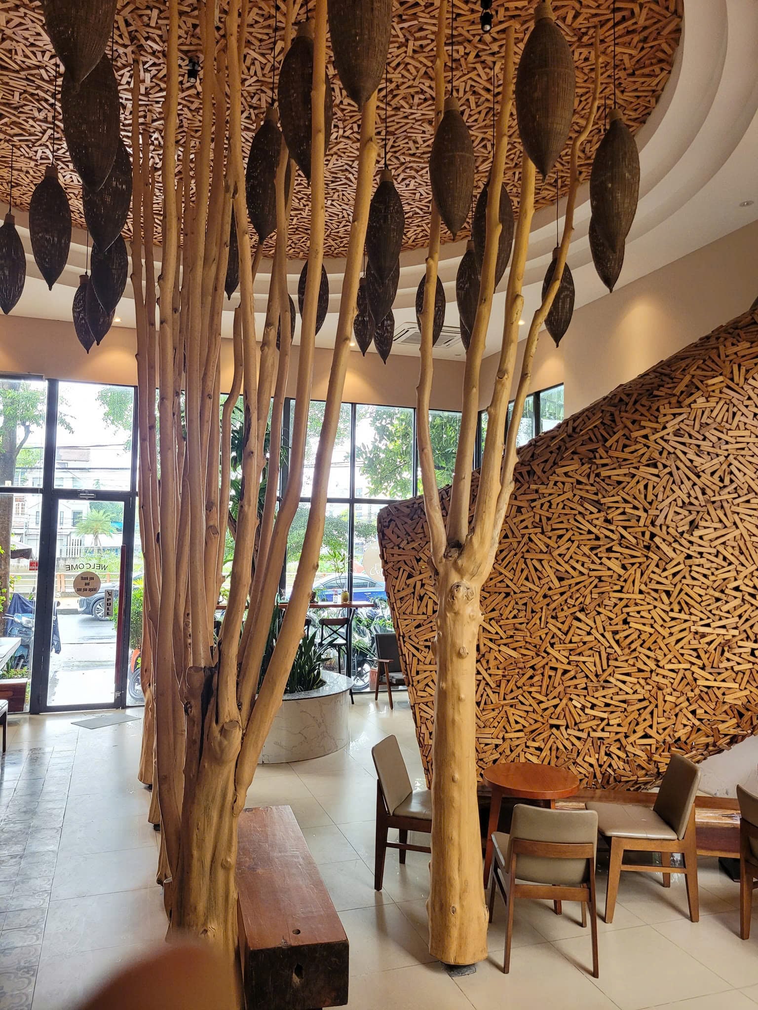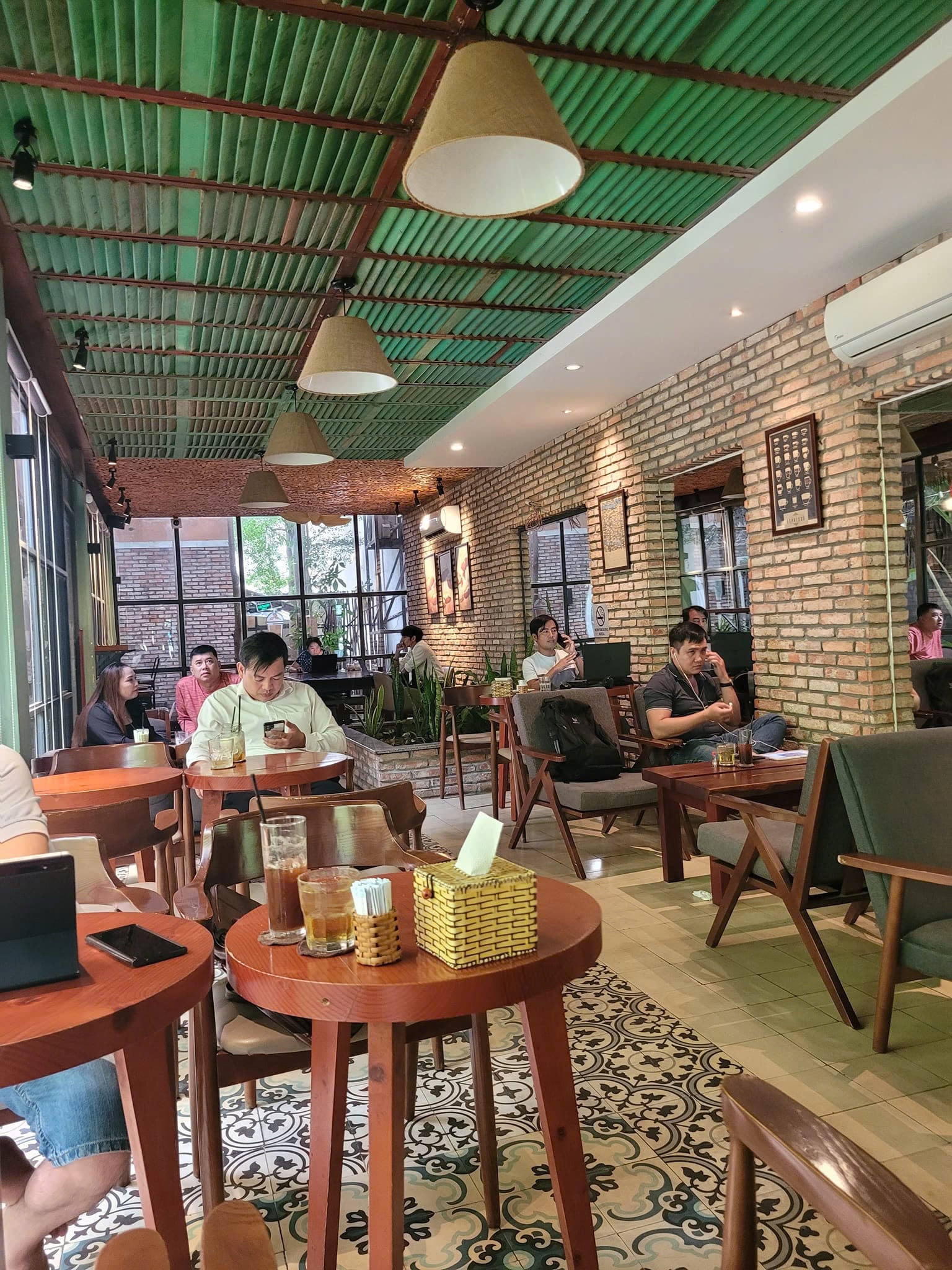 Lấy cảm hứng từ kiến trúc mộc mạc – hiện đại, quán được thiết kế với nhiều mảng xanh, hồ nước, giàn dây rũ và những ô cửa tròn đặc trưng, tạo nên dấu ấn thị giác độc đáo ngay khi bước vào. Mỗi góc đều mang nét nghệ thuật, vừa hài hòa thiên nhiên vừa tối ưu cảm giác thoáng mát, giúp khách có thể dễ dàng “bắt được” những tấm hình tuyệt đẹp.