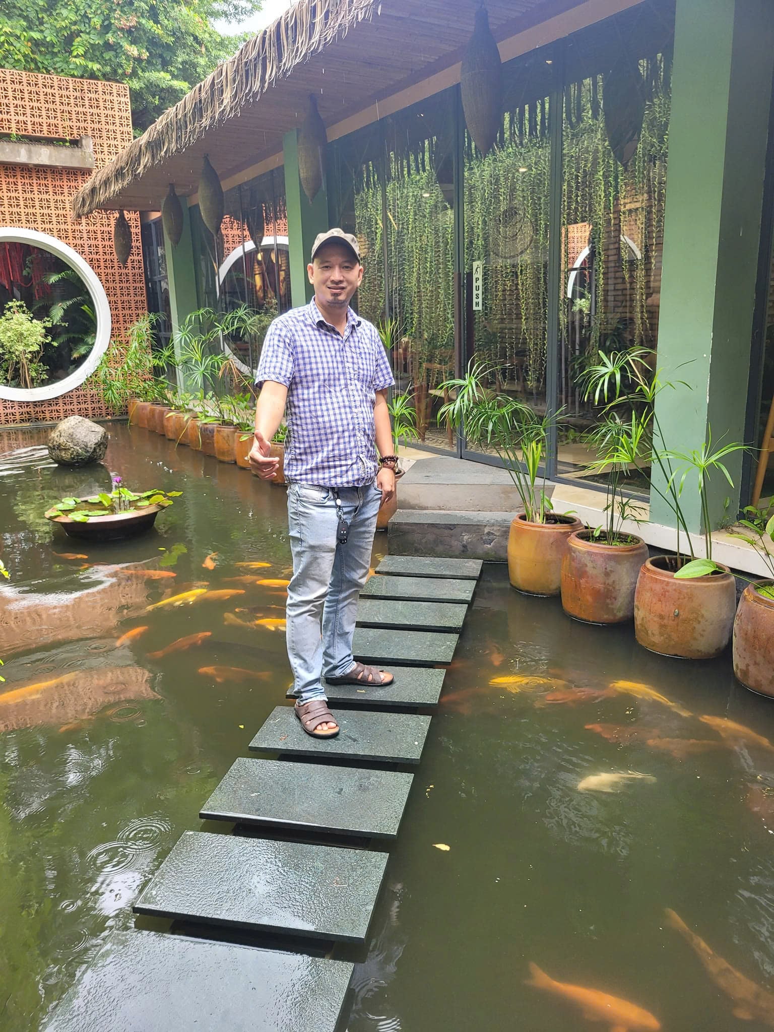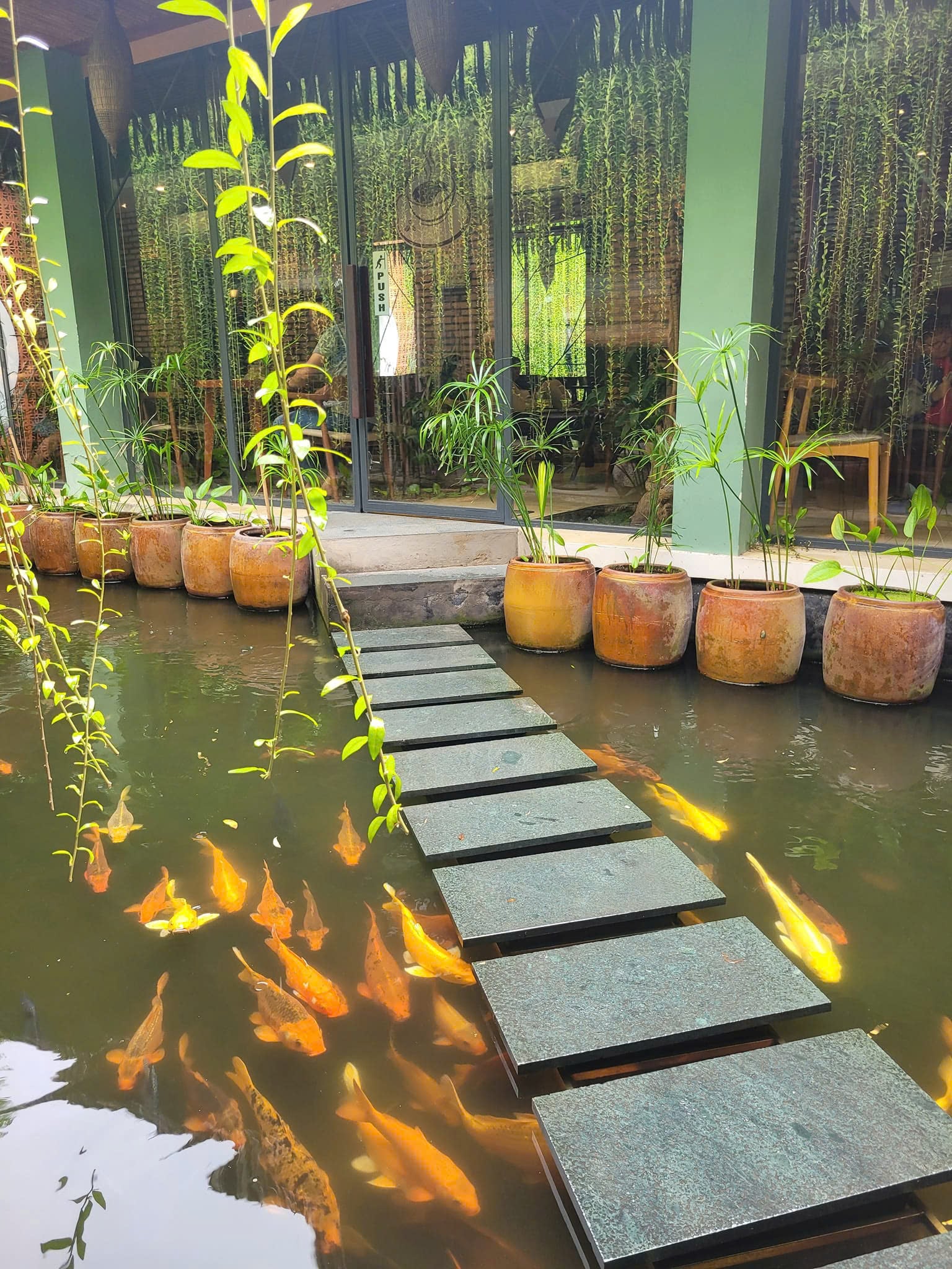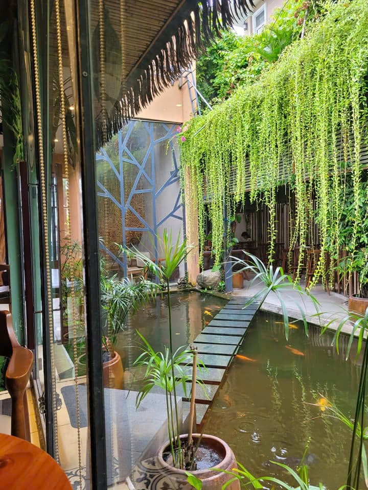 - Khu sân vườn với hồ cá và lối đi lát đá – nơi ai cũng muốn dừng lại check-in.
