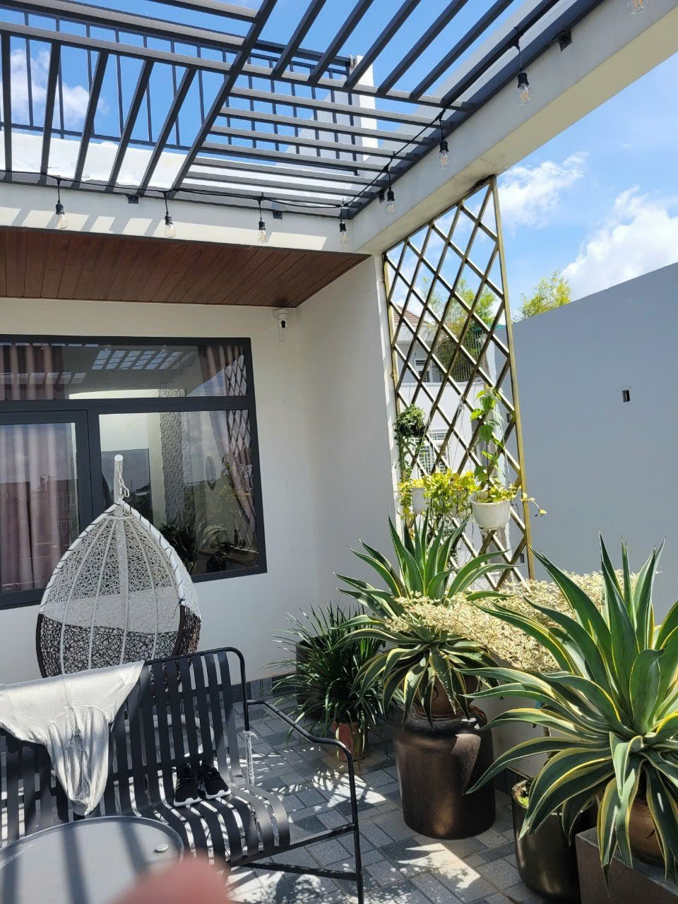 Điểm đặc biệt của công trình là khu sân thượng rộng rãi, được bố trí như một khu vườn nhỏ với nhiều loại cây xanh, tạo không gian thư giãn lý tưởng cho gia đình. Cầu thang xoắn dẫn lên rooftop trở thành chi tiết vừa thẩm mỹ vừa tiện dụng, gắn kết hài hòa giữa kiến trúc và cảnh quan.